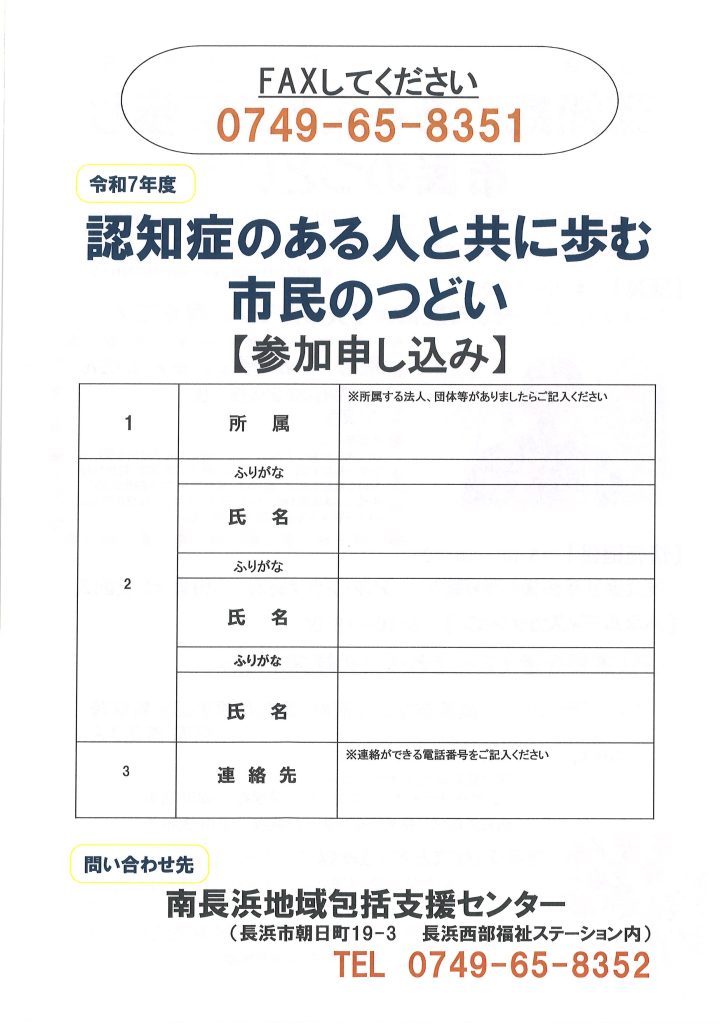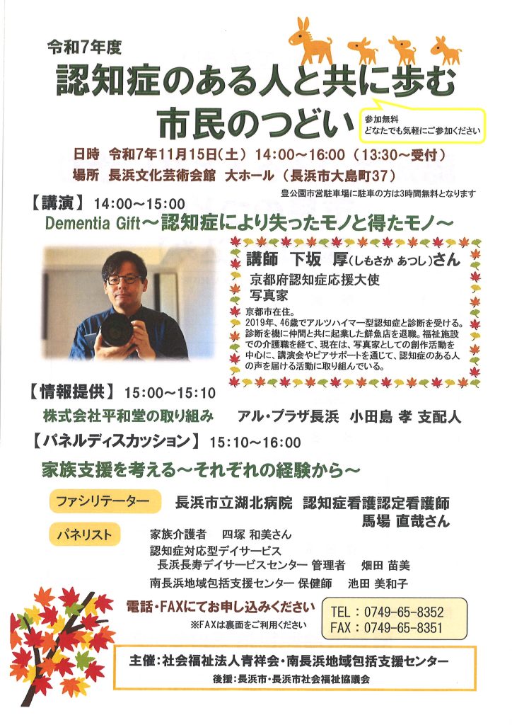 「認知症のある人と共に歩む市民のつどい」のご案内 2025年10月9日 最終更新日時 : 2025年10月9日 iryoushien2755 参加費無料、どなたでもご参加いただけます。お問い合わせ、お申込みは南長浜地域包括支援センターまでお願いします。